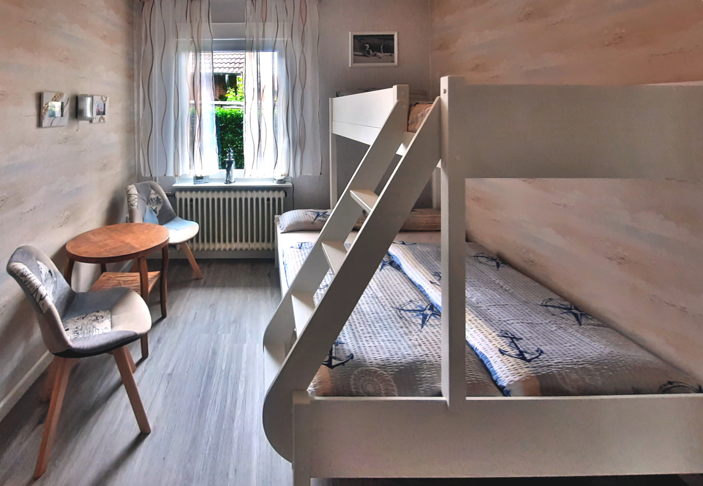 ist eingerichtet mit einem Hochbett (unten 140x200cm, oben 90x200cm), einem Kleiderschrank
